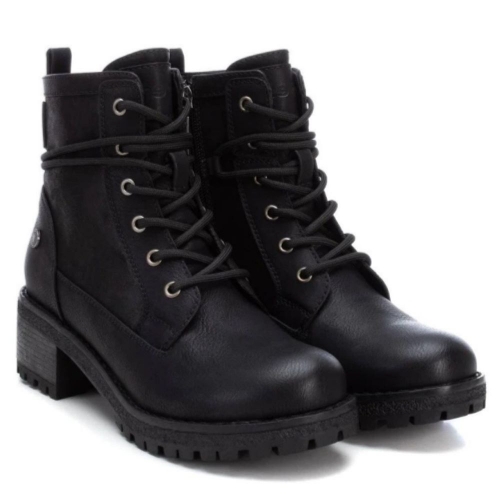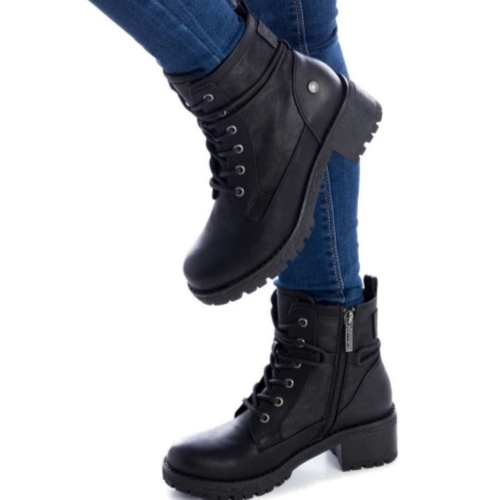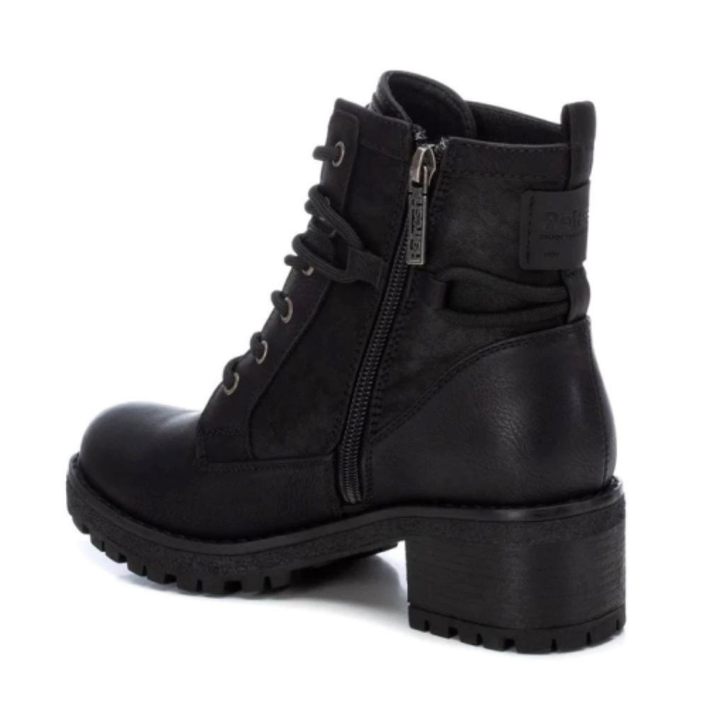 Botín estilo militar de mujer, de la marca Refresh. Fabricado en material que imita la piel. Cremallera lateral y tirador trasero para facilitar la puesta. Ajusta los cordones alrededor del tobillo para darle un toque diferente y en tendencia. Tacón de 5 cm con suela dentada de goma antideslizante. Ideales para un look casual.