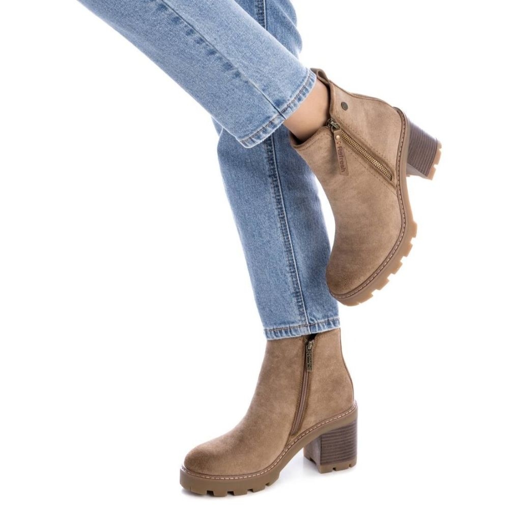 Botín de mujer, de la marca Refresh. Fabricado en una suave antelina. Cierre mediante cremallera lateral. Tirador trasero para facilitar la puesta. Tacón ancho de 8 cm con plataforma delantera para mayor comodidad. Suela de goma antideslizante. Este modelo ha obtenido el certificado vegano por la organización mundial PETA (Organización de los derechos de los animales).