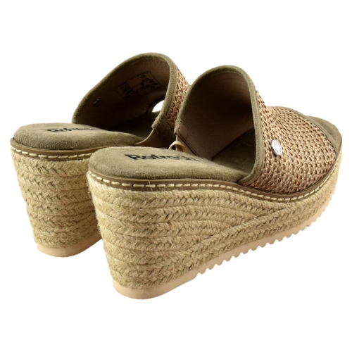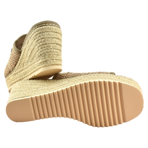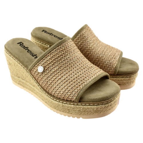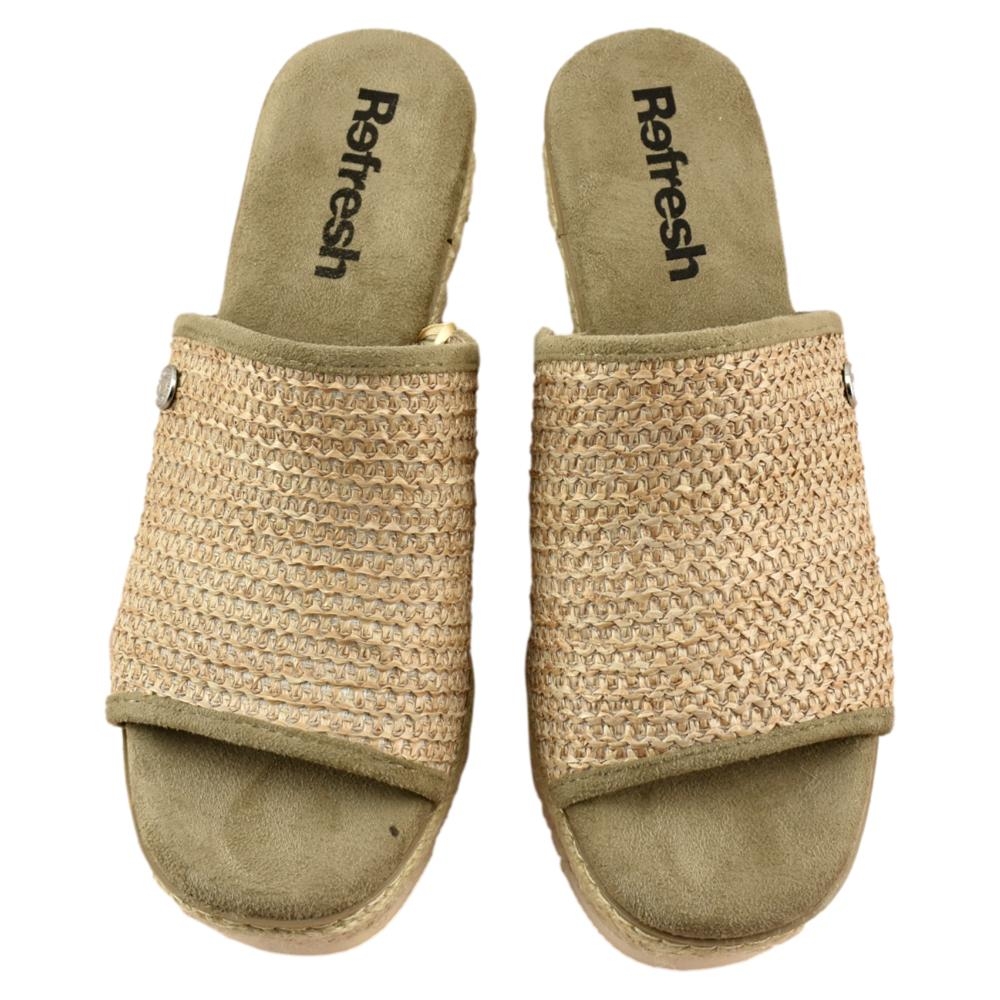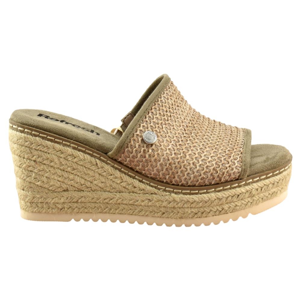 Sandalia de mujer, de la marca Refresh. Fabricada en material textil tipo rafia. Modelo estilo mule con cuña de yute de 8cm y suela antideslizante. Planta acolchada que aporta máxima comodidad en cada pisada. Este modelo ha obtenido el certificado vegano por la organización mundial PETA (Organización de los derechos de los animales).