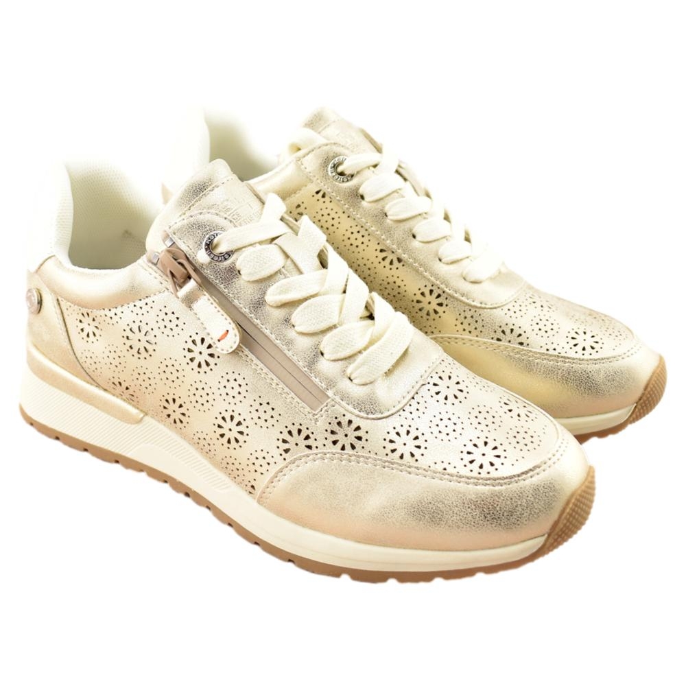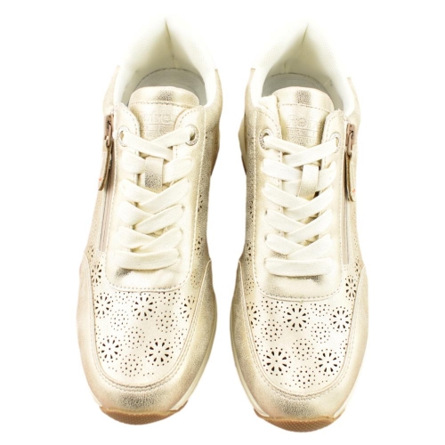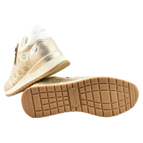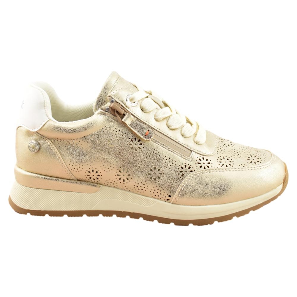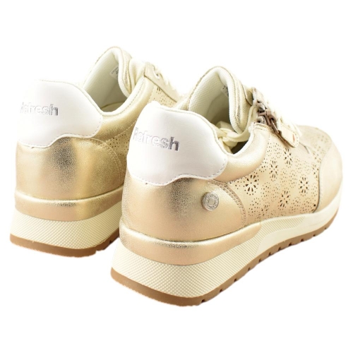 Zapatilla de mujer, de la marca Refresh. Fabricada en material dorado. Cierre mediante cremallera lateral y cordones ajustables. Suela de goma antideslizante. Este modelo ha obtenido el certificado vegano por la organización mundial PETA (Organización de los derechos de los animales).