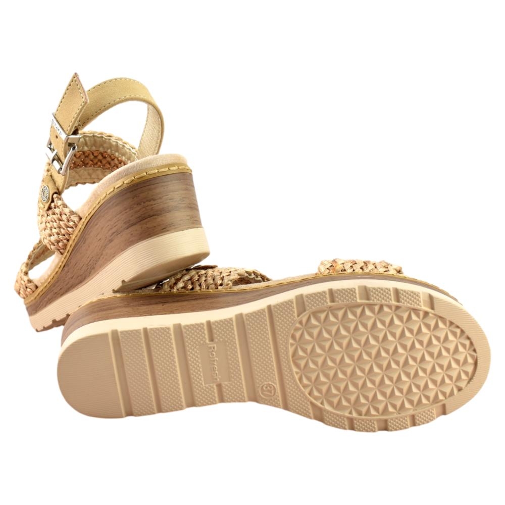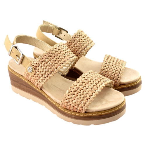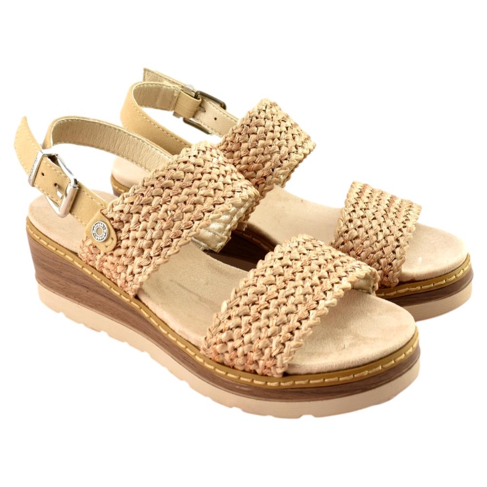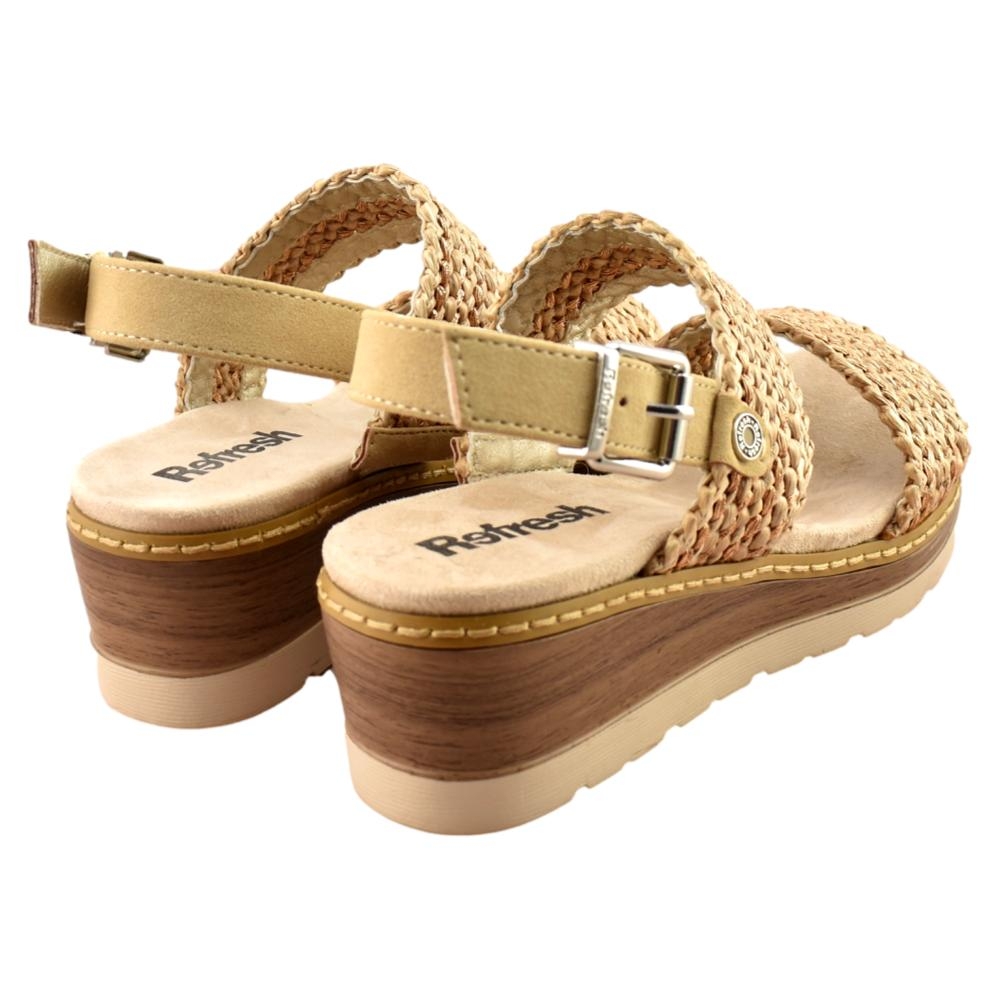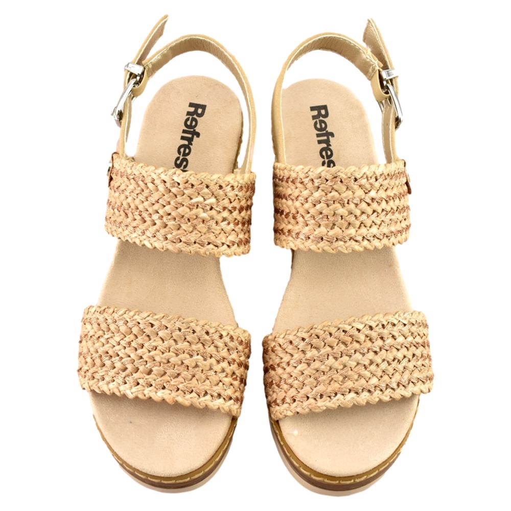 Sandalia de cuña con diseño fresco y natural, ideal para el día a día. Presenta tiras anchas trenzadas que aportan estilo y transpirabilidad, junto con una correa trasera ajustable con hebilla para un mejor ajuste. La plantilla acolchada brinda comodidad durante todo el día, mientras que la cuña ligera ofrece altura y estabilidad. Perfecta para looks veraniegos y casuales.