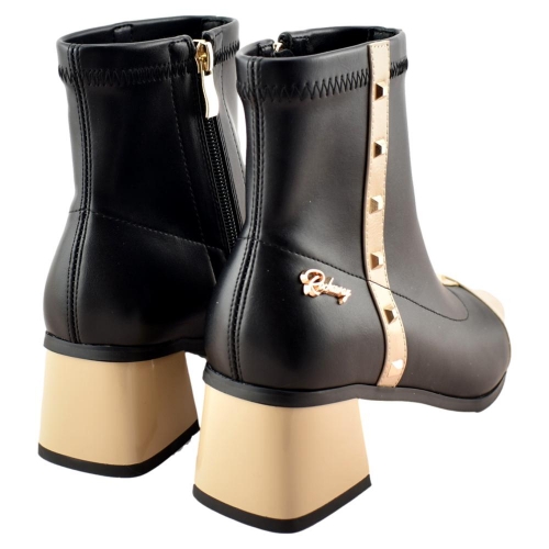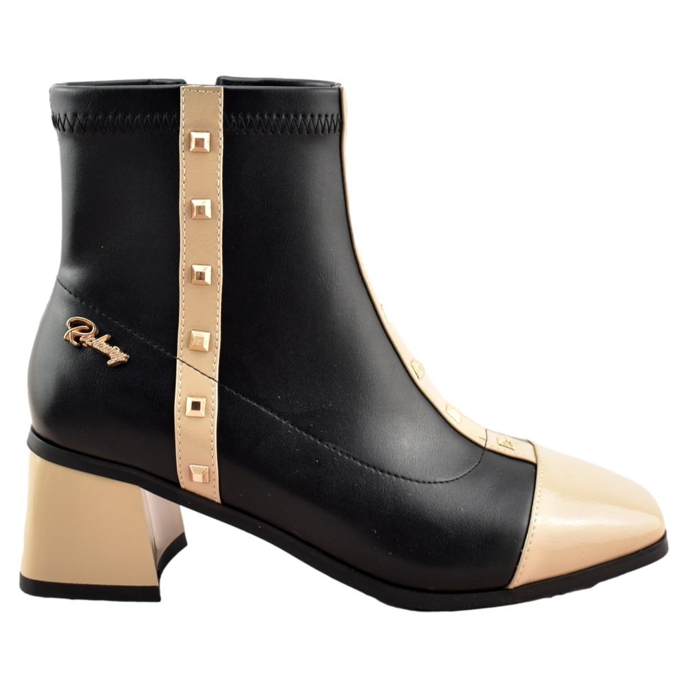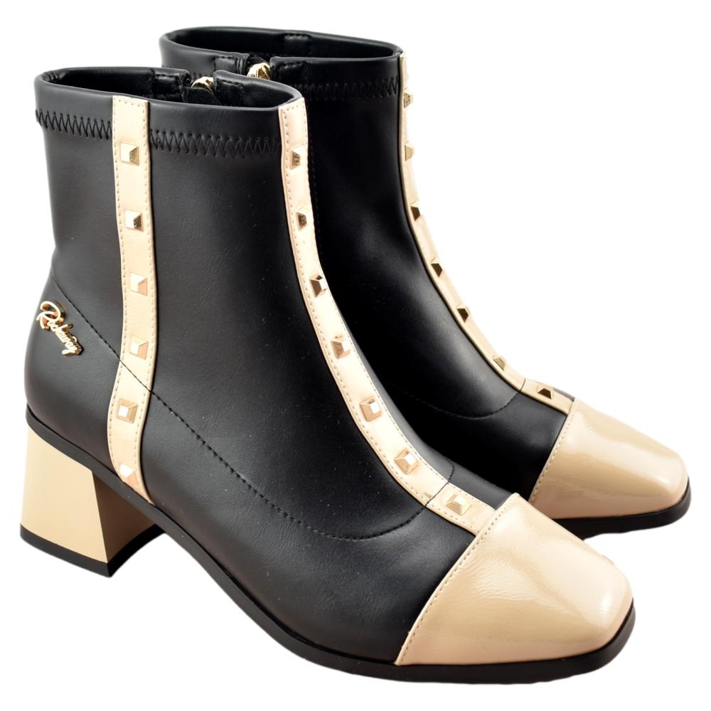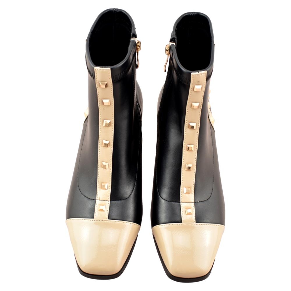 ¡Disfruta este invierno del estilo único de estos botines de tacón cuadrado! Estos botines te proporcionarán un look original con sus tiras bicolor en negro hielo.