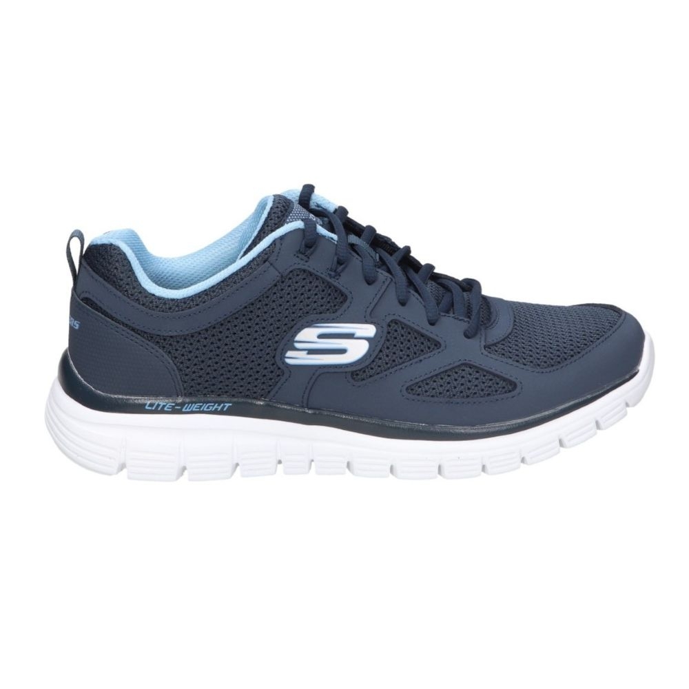 Deportivo Skechers Burns - Agoura, con parte superior de piel Trubuck de aspecto lisa y paneles de malla transpirable estabilizada con base de tela, en color azul.