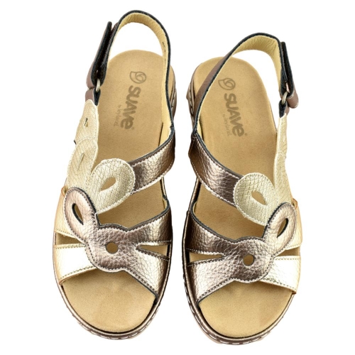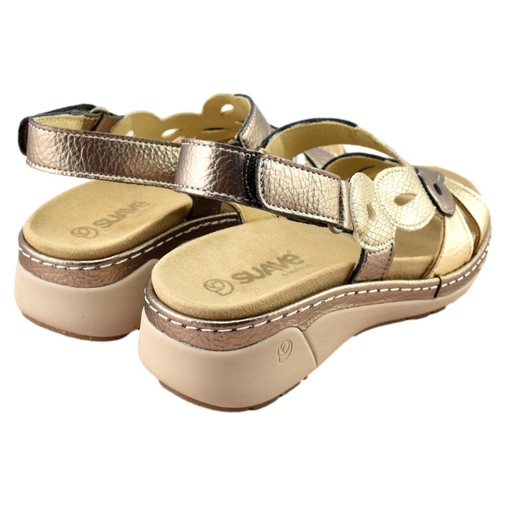 Sandalia muy cómoda de la marca Suave, que nos presenta un piso flexible y ligero. El aumento de la base de apoyo aporta más confort y estabilidad en cada pisada. Incorpora plantilla acolchada extraíble y tira trasera con cierre adhesivo.