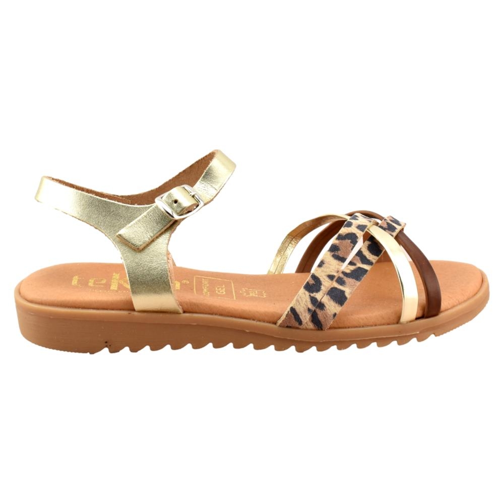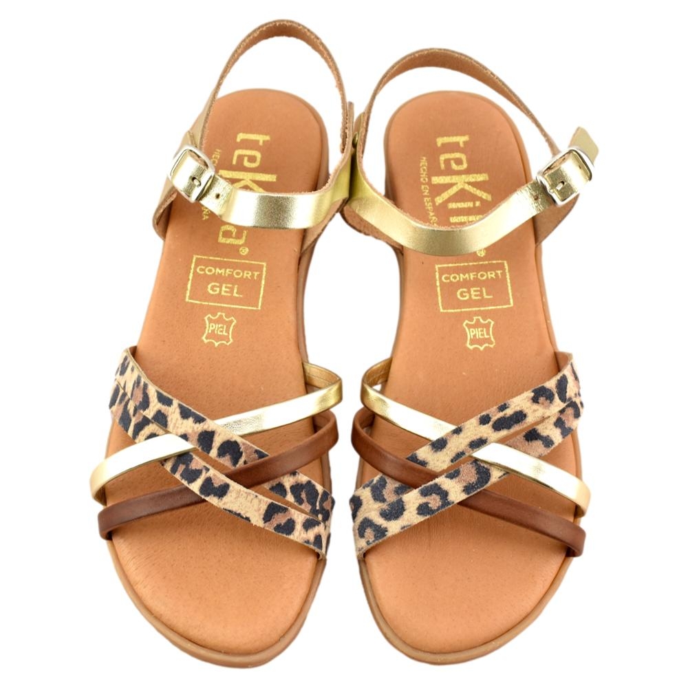 FABRICADO EN ESPAÑA. Sandalias de piel muy cómodas con planta de gel y piso super-flexible de goma. Titas delanteras y pulsera con cierre de hebilla. Combinada en tonos cuero y animal print.