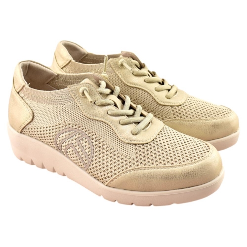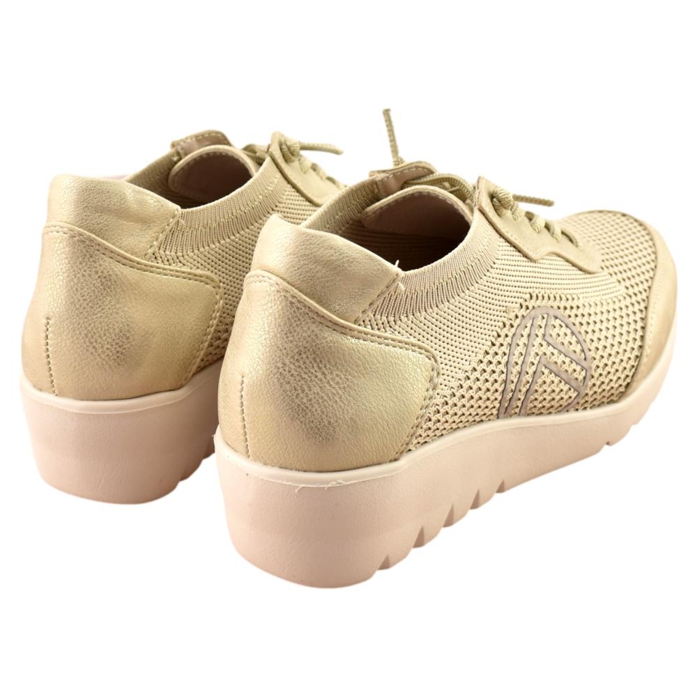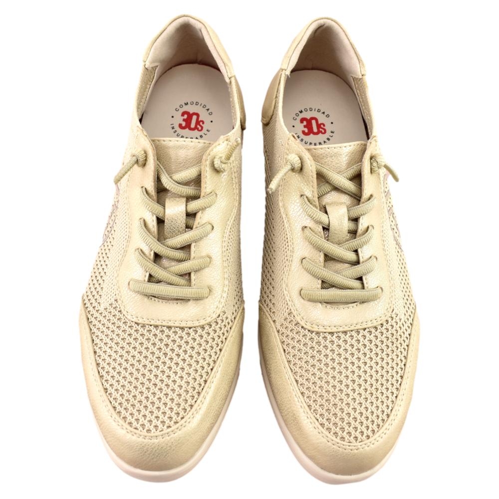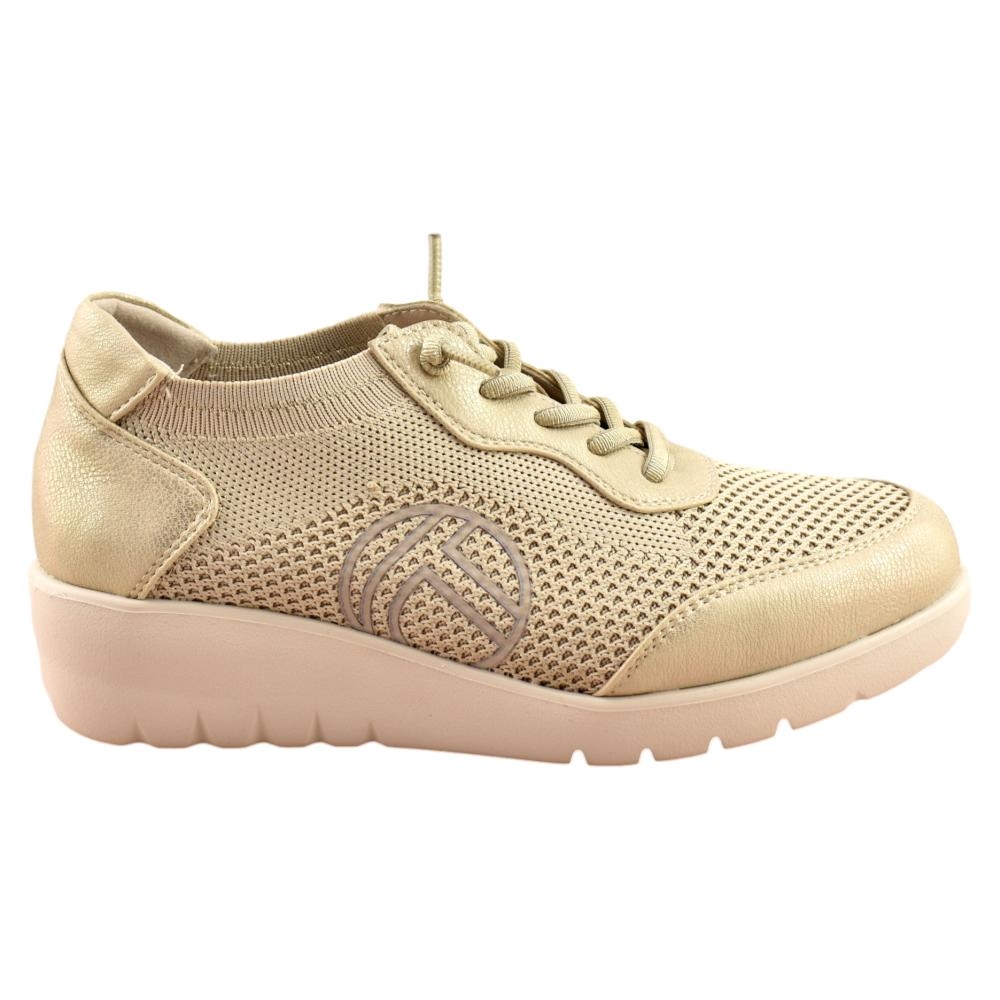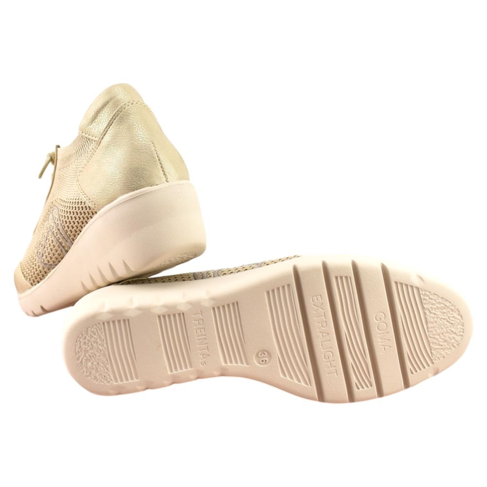 Zapato con plantilla acolchada extraíble. Piso muy ligero y flexible con cuña de 4cm. Fabricado en lona transpirable y piel con cierre de cordón elástico.