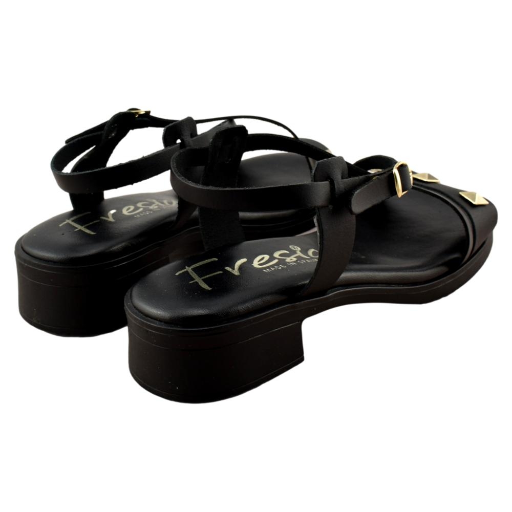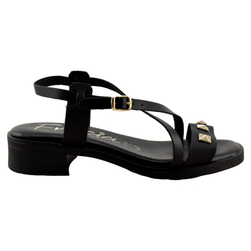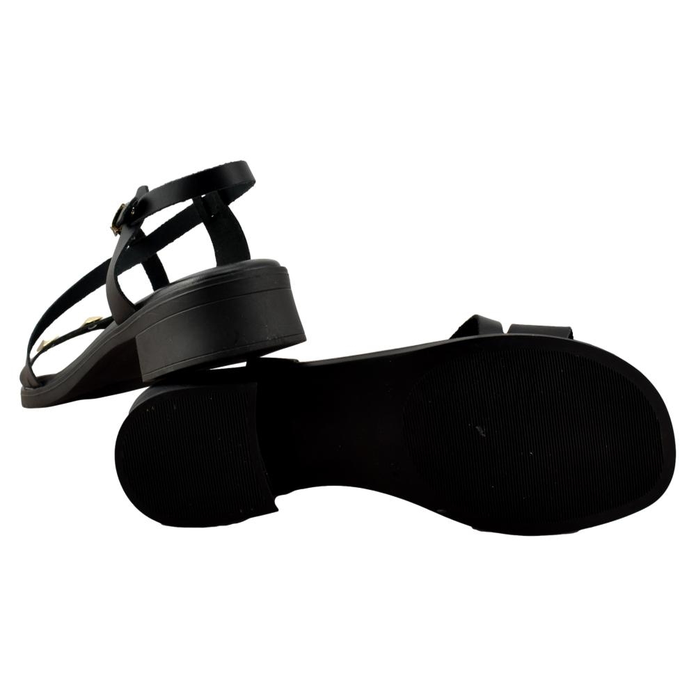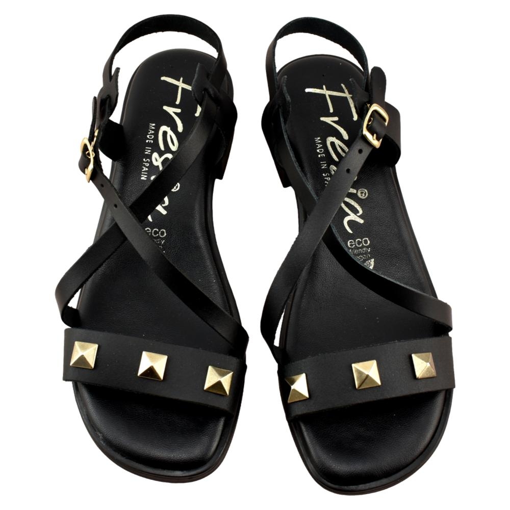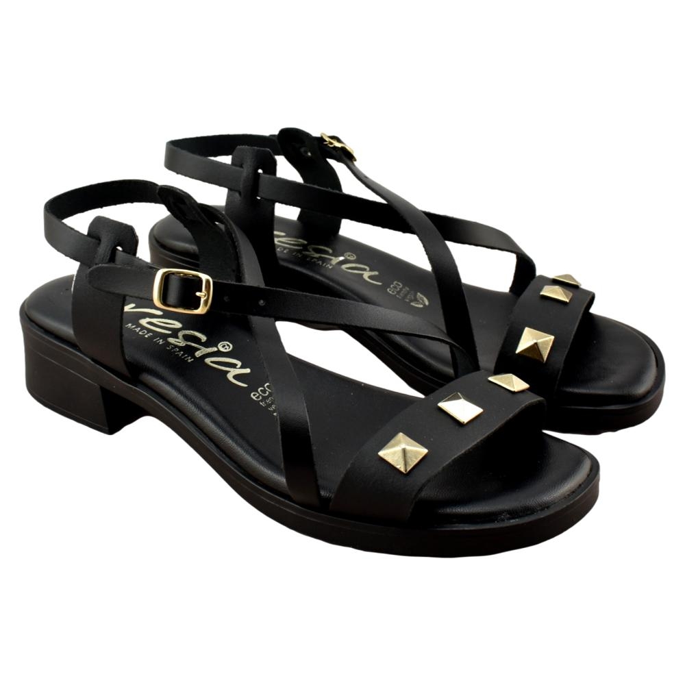 FABRICADO EN ESPAÑA. Sandalias de tiras en negro y tachuelas en la tira delantera. Cierre trasero de hebilla. Piso de goma flexible y tacón de 3cm.