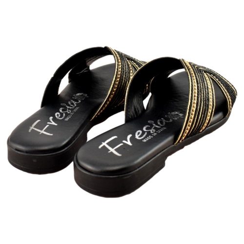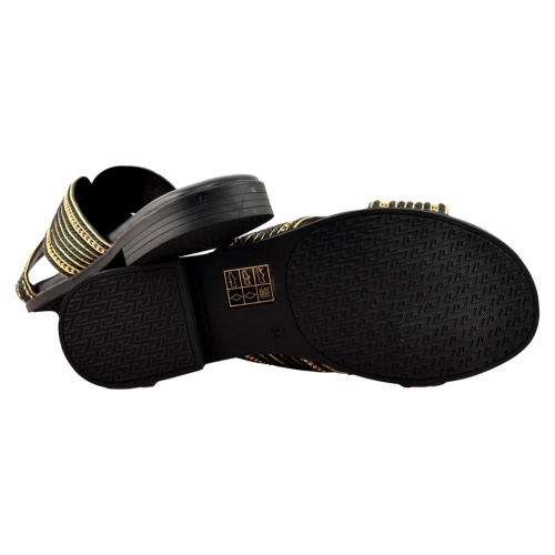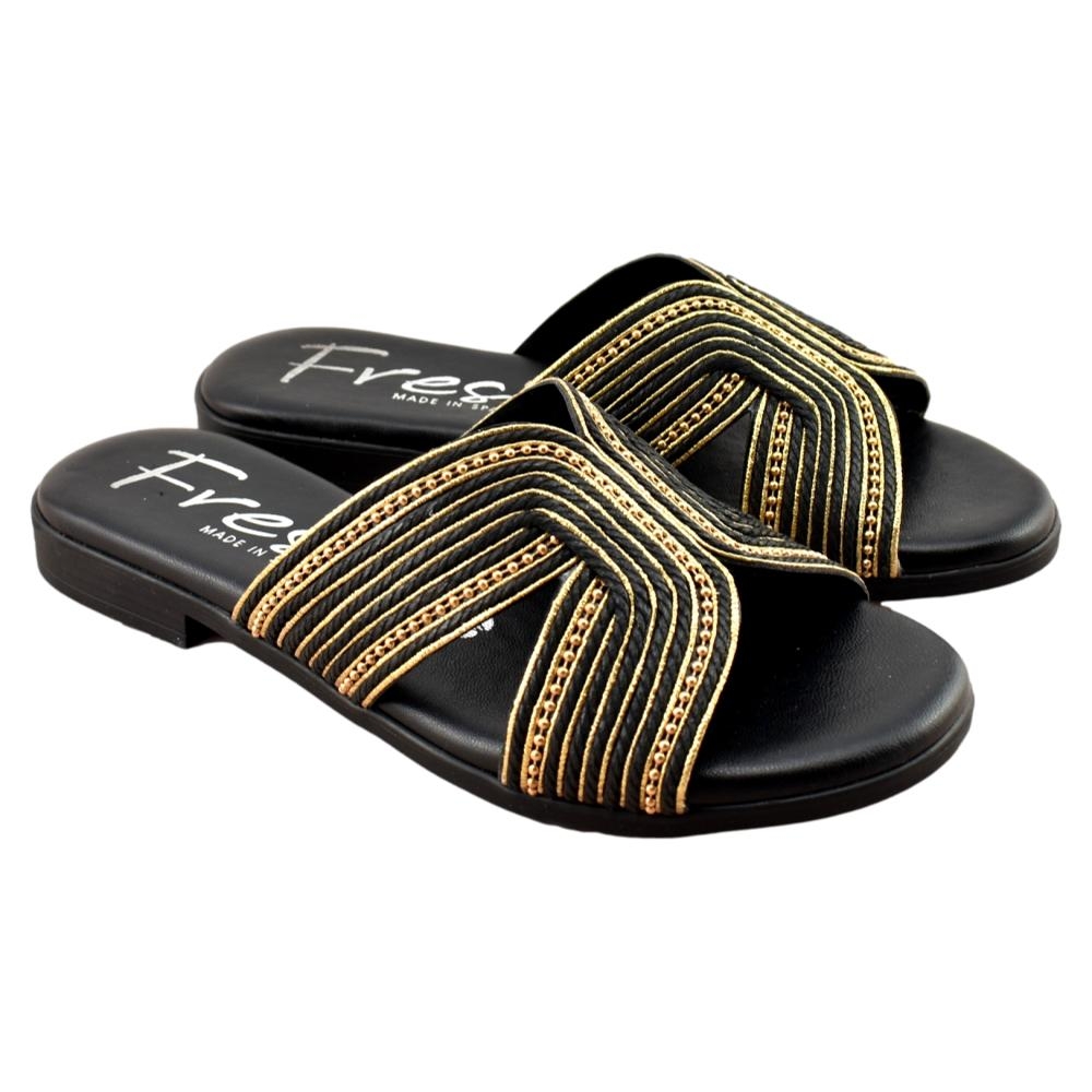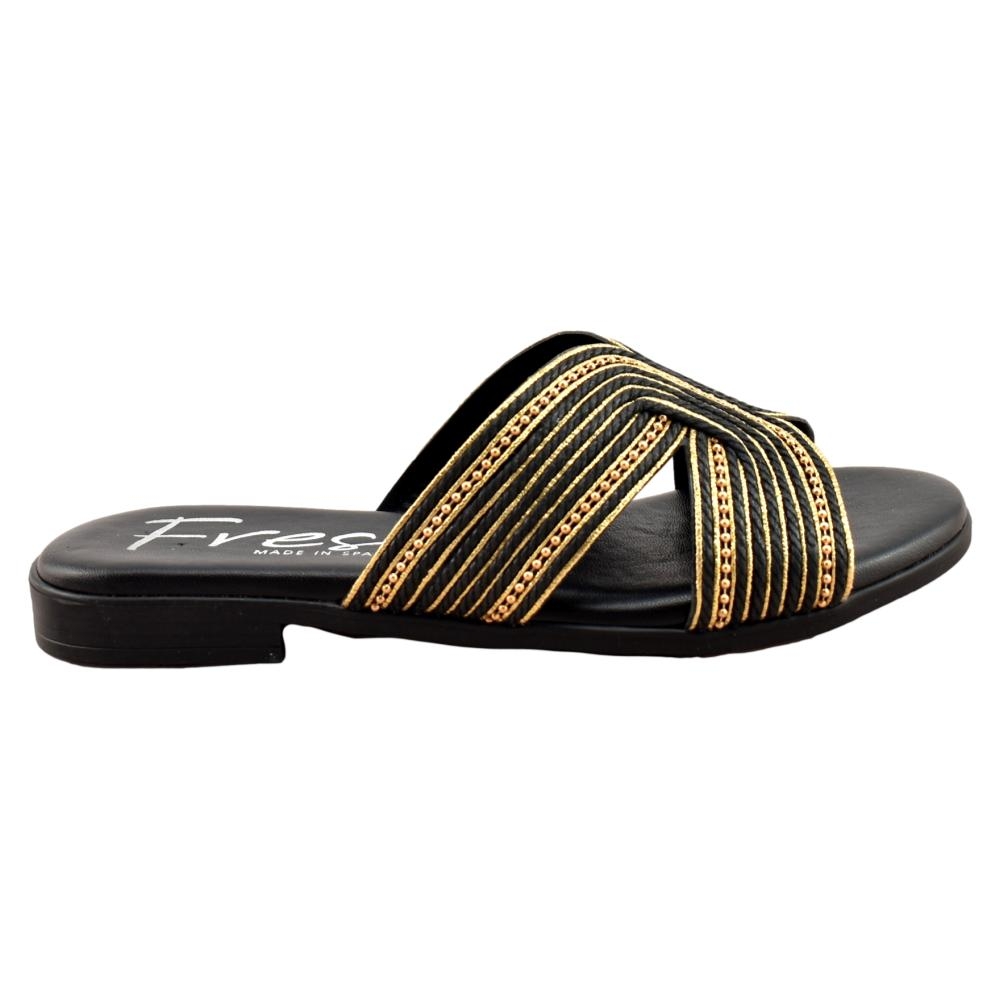 FABRICADO EN ESPAÑA. Sandalias de mujer elegantes y cómodas, ideales para el día a día o para ocasiones especiales. Diseñadas con una banda ancha en acabado negro y detalles decorativos en tono dorado que aportan un toque sofisticado. Cuentan con planta acolchada para mayor confort en cada paso. Fabricación nacional, cuidando la calidad y los acabados.