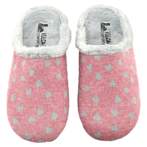 FABRICADO EN ESPAÑA. Zapatillas destalonadas con forro muy suave y cálido. Diseño en color maquillaje con corazones. Piso de goma antideslizante y flexible.