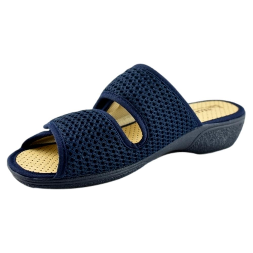 FABRICADO EN ESPAÑA. Zapatilla de rejilla con velcros. Gran abertura, ideal para pies muy anchos. Piso de goma flexible y antideslizante.