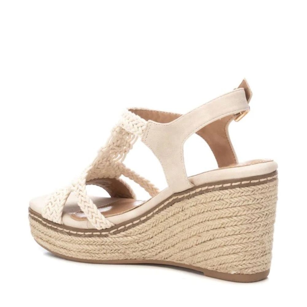 Sandalia de mujer, de la marca Xti. Fabricada en tejido estilo macramé. Cierre mediante hebilla al tobillo. Cuña de 8 cm con plataforma delantera forrada en yute trenzado. Suela de goma antideslizante. Este modelo ha obtenido el certificado vegano por la organización mundial PETA (Organización de los derechos de los animales).